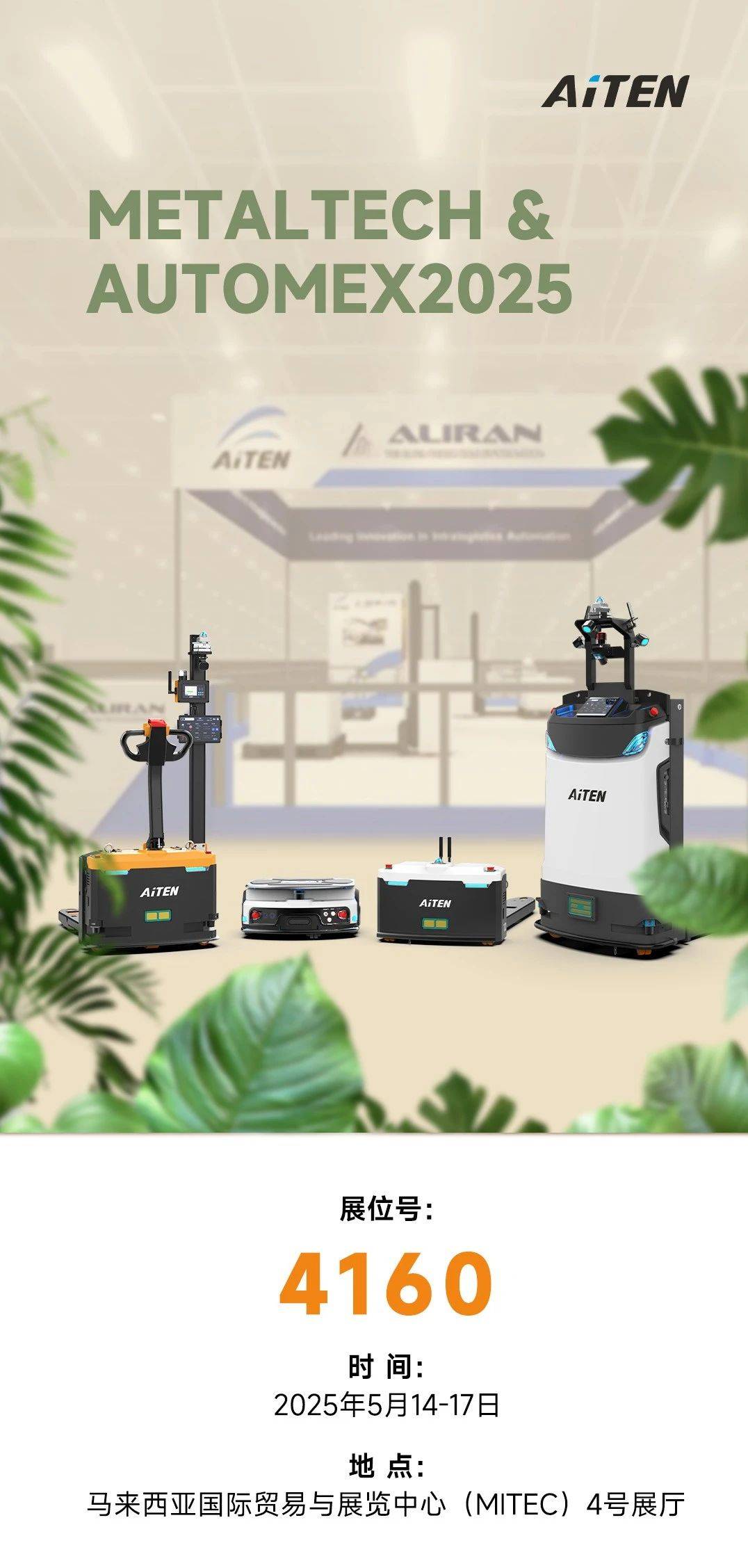 倒计时启动!诚邀您参与现场动态演示,yabo鸭脖AiTEN将携搬运移动机器人AM15,MP10,APE15,TT15惊艳亮相(2025.5.14-17)。